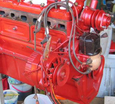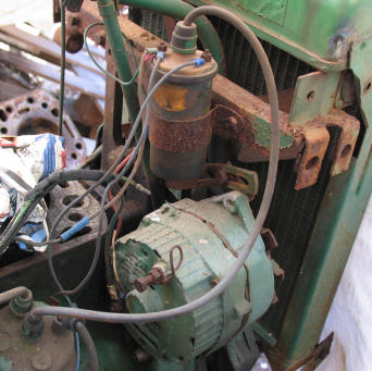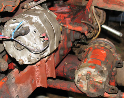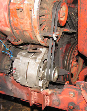 This Ford works just fine with a Chevy alternator! We suspect that whoever did the conversion used the pulley from the original generator, as it is a little larger than we are used to seeing. You'll have to try a pulley transplant on tractors with wide belts. Note, too, that the integral coil on the front-mounted distributor needs to be a 12 volt unit. These are readily available. |