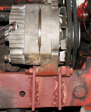 We cut off two pieces of steel and burned bolt holes in them. They were cleaned up with a grinder. The frame was notched and ground. The two brackets were bolted to the alternator. Alignment was accomplished by clamping a flat bar across the crankshaft pulley and pushing the alternator flat to it. While that was held in place, we welded the brackets to the frame. The old top bracket had the wrong curve. We thinned the bottom of a straight one from a Massey-Harris combine and used a nut between it and the alternator to make the alignment perfect. With temporary wiring and bolts in place, we put on the belts and fired it up. It works great. |