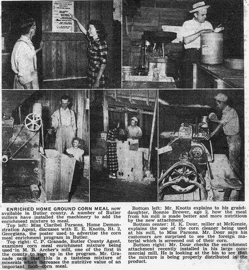 Earnest E. Knotts was known over most of Butler County from 1947 to 1962 for his home-ground meal. In 1947, with help from his son-in-law George H. Brewer, the grist mill was installed on the family farm just outside the city limits, east of Georgiana, Alabama. Grinding corn was mostly a weekend operation and one which drew family members together to experience the novelty of grinding corn into meal, not only for the family, but also for other farmers who brought their corn to be ground. A regular assistant to Mr. Knotts was his son, James, who came with his family on the weekend to help and to enjoy the company of other family members who often came home to visit, enjoy the delicious home-cooked meals prepared by Mrs. Knotts, and to experience family camaraderie. Saturday, the usual meal-grinding day, was not just a work day; it was a celebration of family. Mr. Knotts also supplied local stores with the delicious corn meal, neatly bagged, labeled, and often still warm from being immediately dipped from the bin. Hence many people in Butler County besides the farmers were able to enjoy this tasty product. To add to the nutritive value of the meal, Mr. Knotts installed an attachment which added an enrichment supplement to the meal. The supplement was a tasteless mixture of minerals which was distributed uniformly throughout the product during the milling process. Mr. Knotts' failing health was the primary reason for closing the operation. He died August 22, 1968. Though the grist mill belongs to an earlier era, it is a reminder of how such operations brought family and community together in a very wholesome way. |